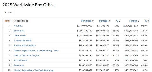 This is one of the first decades without the assistance of China, and why would they need us when the top movie of the year made $2.1 BILLION almost exclusively in China alone. Ne Zha 2, an animated children’s movie epic that’s over 2 hours long.